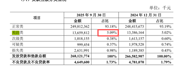 其次,2025年前三季关注类贷款占比升至5.09%,较上年末有所提高。且损失类贷款余额较上年末大增121.29%,占贷款总额比升至0.98%,反映出部分风险已从“潜在”转化为“实际”,有存量风险处置压力。